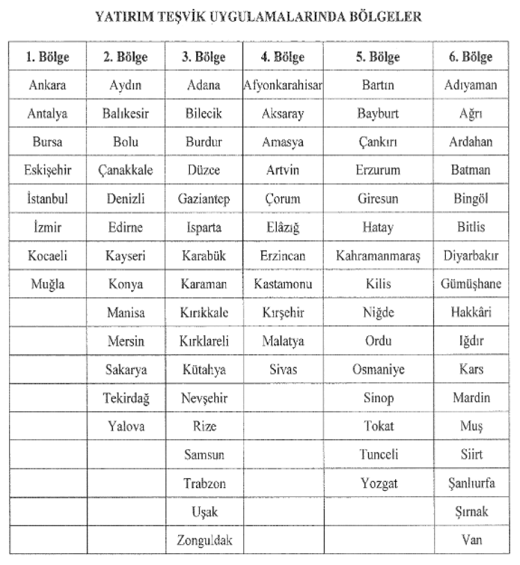 Yatırım teşvik uygulamalarında iller ve bölgeleri şöyle belirlendi: