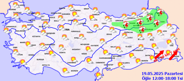 ANKARA (İGFA) - Meteoroloji Genel Müdürlüğü tarafından yapılan tahminlere göre: Ülkemizin kuzeydoğu kesimlerinin parçalı ve çok bulutlu, Doğu Karadeniz, Doğu Anadolu'nun kuzey kesimleri ile Ordu, çevrelerinin sağanak ve gök gürültülü sağanak yağışlı+ geçeceği tahmin ediliyor. Doğu Anadolu'nun güneydoğusunda toz taşınımı bekleniyor.