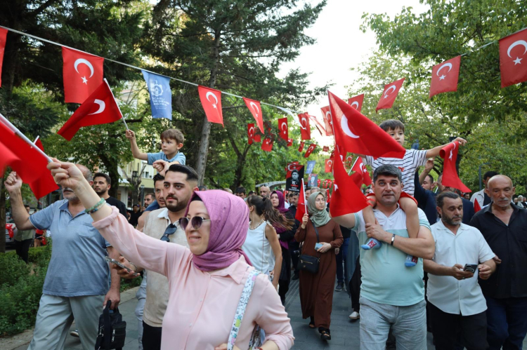 KOCAELİ (İGFA) - 15 Temmuz’un 9. yılında Kocaeli, bir kez daha tarih yazdı. “Zaferin Adı Türkiye” kortej yürüyüşüne binlerce vatandaş akın etti. Kadın, erkek, yaşlı, genç, çocuk demeden herkes ellerinde Türk bayraklarıyla meydanlara koştu. Tıpkı 9 yıl önceki gibi milletin tek yürek olduğu bu yürüyüşte, birlik ve beraberlik en güçlü haliyle hissedildi.
