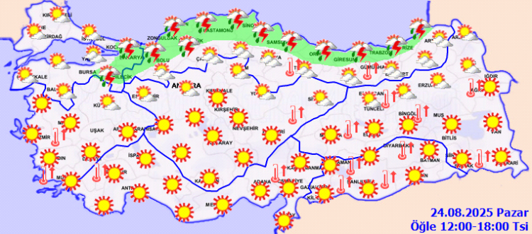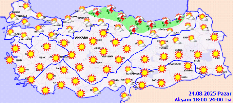 Meteoroloji Genel Müdürlüğü'nün 24 Ağustos tarihli değerlendirmesine göre, Türkiye'nin kuzey kesimleri ile Doğu Akdeniz'de parçalı ve yer yer çok bulutlu hava etkili olacak.
