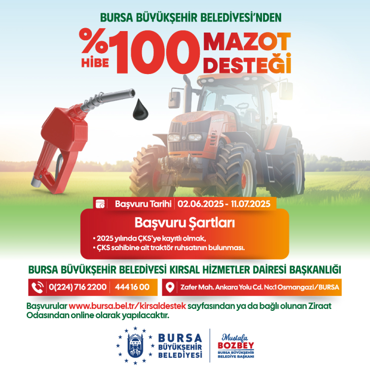 Bursa Büyükşehir Belediyesi, üreticilerin desteklenmesi ve girdi maliyetlerinin azaltılması amacıyla yüzde 100 hibe ‘Mazot Desteği’ Projesi’ni hayata geçirdi. Başvurular, 11 Temmuz 2025 tarihine kadar www.bursa.bel.tr/kirsaldestek sayfasından ya da bağlı olunan ziraat odasından online olarak yapılabilecek.