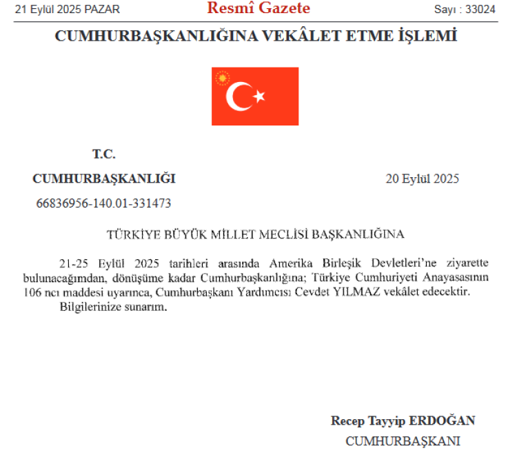 Tezkereye göre, 21-25 Eylül tarihleri arasında Amerika Birleşik Devletleri'ne ziyarette bulunacak Cumhurbaşkanı Recep Tayyip Erdoğan'ın dönüşüne kadar, Cumhurbaşkanlığına, Anayasa'nın 106'ncı maddesi uyarınca Cumhurbaşkanı YardımcısıCevdet Yılmaz vekalet edeceği kaydedildi.