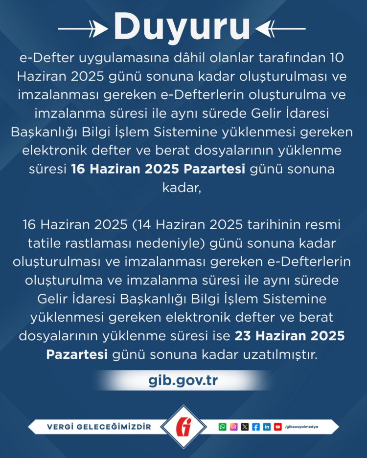 16 Haziran 2025 (14 Haziran’ın resmi tatil olması nedeniyle) sonuna kadar oluşturulması ve imzalanması gereken e-Defterler ve berat dosyalarının yüklenme süresi ise 23 Haziran 2025 Pazartesi gününe kadar uzatıldı.