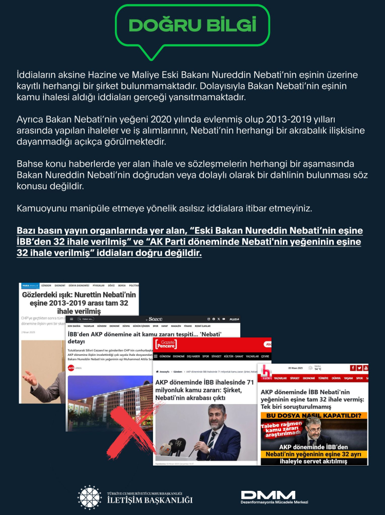 Dezenformasyonla Mcüadele Merkezi tarafından yapılan yazılı açıklamada, "İddiaların aksine Hazine ve Maliye Eski Bakanı Nureddin Nebati’nin eşinin üzerine kayıtlı herhangi bir şirket bulunmamaktadır. Dolayısıyla Bakan Nebati’nin eşinin kamu ihalesi aldığı iddiaları gerçeği yansıtmamaktadır. Ayrıca Bakan Nebati’nin yeğeni 2020 yılında evlenmiş olup 2013-2019 yılları arasında yapılan ihaleler ve iş alımlarının, Nebati’nin herhangi bir akrabalık ilişkisine dayanmadığı açıkça görülmektedir. Bahse konu haberlerde yer alan ihale ve sözleşmelerin herhangi bir aşamasında Bakan Nureddin Nebati’nin doğrudan veya dolaylı olarak bir dahlinin bulunması söz konusu değildir. Kamuoyunu manipüle etmeye yönelik asılsız iddialara itibar etmeyiniz" ifadeleri yer aldı.