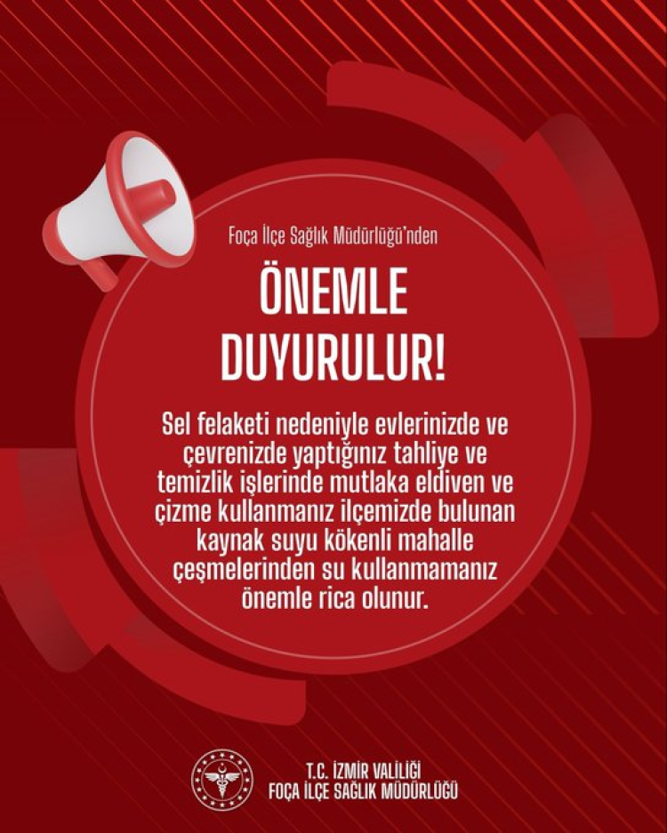 Foça İlçe Sağlık Müdürlüğü'nde önemli bir uyarıda bulunarak; "Sel felaketi nedeniyle evlerinizde ve çevrenizde yaptığınız tahliye ve temizlik işlerinde mutlaka eldiven ve çizme kullanmanız ilçemizde bulunan kaynak suyu kökenli mahalle çeşmelerinden su kullanmamanız önemle rica olunur" denildi.