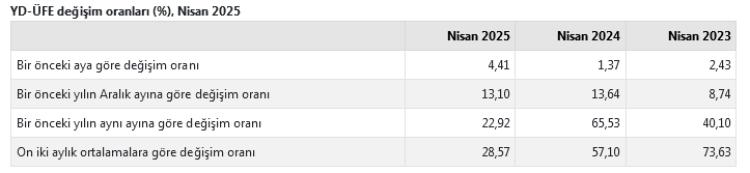 ANKARA (İGFA) - Yurt Dışı Üretici Fiyat Endeksi (YD-ÜFE), Nisan 2025’te bir önceki aya göre yüzde 4,41, bir önceki yılın Aralık ayına göre yüzde 13,10, geçen yılın aynı ayına göre yüzde 22,92 ve on iki aylık ortalamalara göre yüzde 28,57 artış kaydetti.