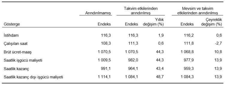 Saatlik kazanç dışı işgücü maliyeti endeksi ise yıllık yüzde 48,7, çeyreklik yüzde 13,9 yükseldi.