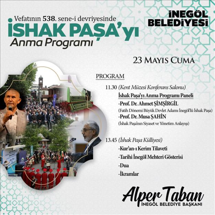 Son 2 yıldır düzenlenen ve artık geleneksel hale getirilerek İnegöl Belediyesi’nin organizasyonuyla bu yıl 3’üncüsü gerçekleştirilecek olan döneminin önemli devlet adamlarından İshak Paşa’nın vefatının 538. yılında anılacağı program için İnegöl Belediye Başkanı Alper Taban davet mesajı yayınladı. Başkan Alper Taban, “İnegöl’ümüzün yetiştirdiği, Osmanlı Devleti döneminin önemli devlet adamlarından, iki padişah döneminde Veziriazamlık yapmış İshak Paşa’yı anma programımızı geleneksel hale getirdik. Bu yıl da 23 Mayıs Cuma günü saat iki özel programla anma programını gerçekleştireceğiz. 11.30’da İnegöl Kent Müzemizin konferans salonunda Prof. Dr. Ahmet Şimşirgil ile Prof. Dr. Musa Şahin’in konuşmacı olarak katılacağı panel ve akabinde Cuma namazı sonrası 13.45’te İshak Paşa Külliyesinde; Kuran-ı Kerim Tilavetleri, Tarihi İnegöl Mehteri gösterileri, dualar ve ikramlarla bir program icra edilecek. Her iki programa da tüm ilçe halkımızı davet ediyoruz” dedi.