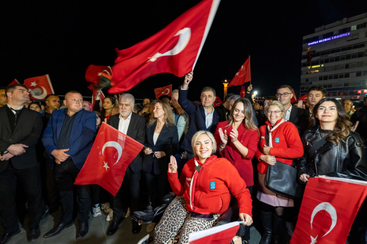 İzmir Büyükşehir Belediye Başkanı Dr. Cemil Tugay, 29 Ekim Cumhuriyet Bayramı’nda binlerce İzmirli ile fener alayında buluştu. İzmirliler 350 metrelik Türk bayrağı taşıyarak Cumhuriyet coşkusuna ortak oldu. Konak’tan Cumhuriyet Meydanı’na devam eden fener alayı ve havai fişek gösterisi renkli görüntülere sahne oldu.