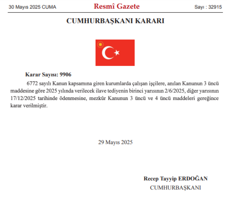6772 Sayılı Kanun kapsamında devlet ve bağlı kurumlarda çalışan işçilere 2025 yılında yapılacak ilave tediye ödemelerinin tarihleri, Resmi Gazete’de yayımlanan 9906 sayılı Cumhurbaşkanı Kararı ile aç...