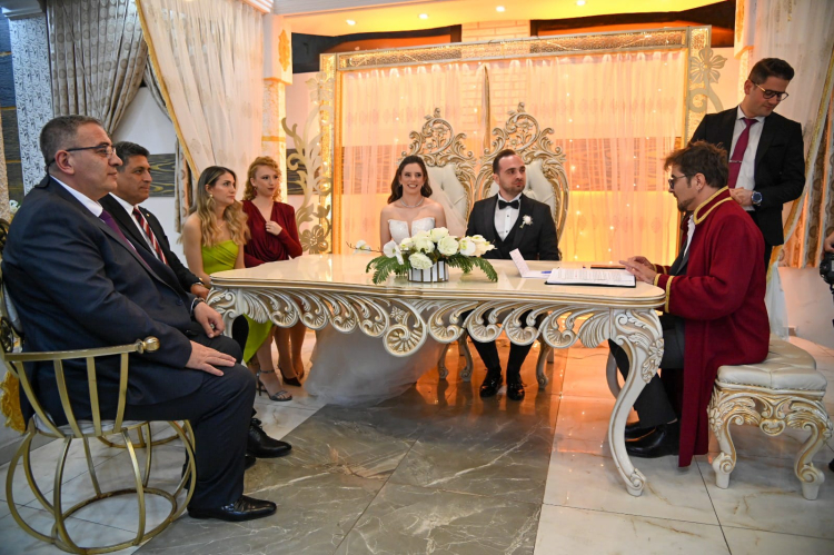 MANİSA(İGFA) - Manisa'nın Saruhanlı İlçesi’nde gerçekleşen düğün töreninde, çiftin nikahını Manisa Büyükşehir Belediyesi Başkan Vekili Ahmet Anıl Ceylan kıyarken Genel Sekreter Burak Deste ve Genel Sekreter Yardımcısı Oğuz Murat Pınar da nikah şahitliği yaptı. Başkan Vekili Ahmet Anıl Ceylan, genç çifte ömür boyu mutluluklar dileyerek, “Çağlar Bey ve Şeyda Hanım’a bu mutlu günlerinde eşlik etmekten büyük onur duyduk. Kendilerine bir ömür boyu sürecek sevgi, saygı ve huzur dolu bir yuva diliyorum” ifadelerini kullandı.