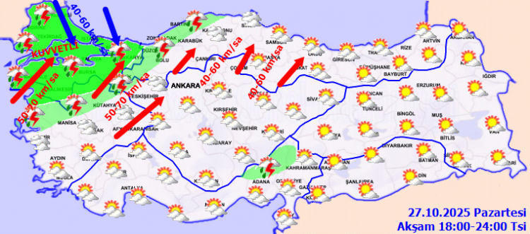 ANKARA (İGFA) - Meteoroloji Genel Müdürlüğü, 27 Ekim Pazartesi gününe ilişkin hava tahmin raporunu yayımladı.