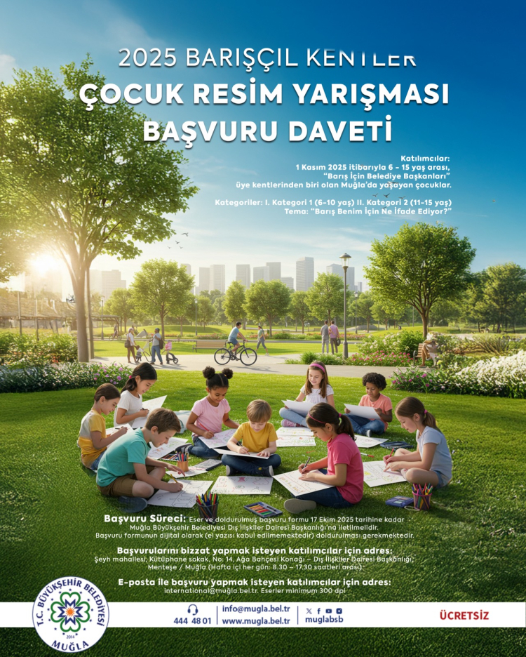 Muğla Büyükşehir Belediyesi, Japonya merkezli Mayors for Peace – Barış İçin Belediye Başkanları ağı tarafından düzenlenen 2025 “Barışçıl Kentler” Çocuk Resim Yarışması’na başvuruları almaya başladı.