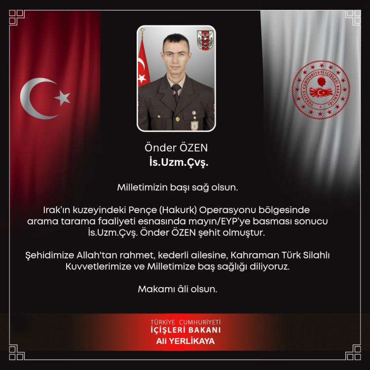 Irak’ın kuzeyindeki Pençe Operasyon bölgesinde icra edilen arama tarama faaliyeti esnasında EYP’ye basması sonucu yaralanan askerimiz Uzman Çavuş Önder Özen şehit oldu.