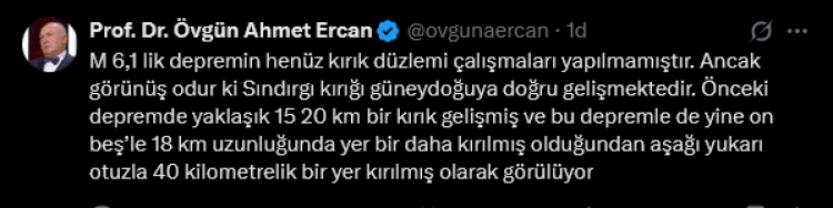 Balıkesir’in Sındırgı ilçesinde meydana gelen 6.1 büyüklüğündeki depremin ardından Jeofizik Yüksek Mühendisi Prof. Dr. Övgün Ahmet Ercan, Halk TV ve Sözcü TV yayınlarında yaptığı değerlendirmelerde ve sosyal medya paylaşımında, depremle ilgili dikkat çeken açıklamalarda bulundu.