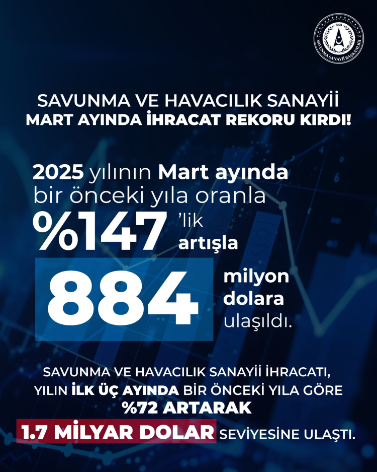 ANKARA (İGFA) - Savunma Sanayii Başkanı Prof. Dr. Haluk Görgün, sosyal medya hesabından yaptığı paylaşımda, savunma ve havacılık ihracatının 2025 Mart’ta geçen yıla göre yüzde 147 artarak 358 milyon dolardan 884 milyon dolara yükseldiğini duyurdu.