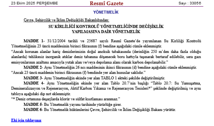Çevre Bakanlığı, Su Kirliliği Kontrolü Yönetmeliği'nde denizlerde atık bertarafı ve karbon depolama için yeni hükümler getirdi. Korunan alanlar dışında 250 metre derinlikte tehlikesiz atık bertarafı ve karbon depolama izinli hale geldi.