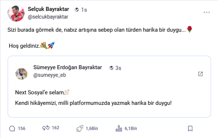 Bayraktar’ın platforma katılımı, takipçileri arasında büyük bir coşkuyla karşılanırken, platformun kurucusu Selçuk Bayraktar, eşi Sümeyye Erdoğan Bayraktar’ın Next Sosyal’e adım atmasını, “Sizi burada görmek de, nabız artışına sebep olan türden harika bir duygu... Hoş geldiniz!” sözleriyle kutladı.