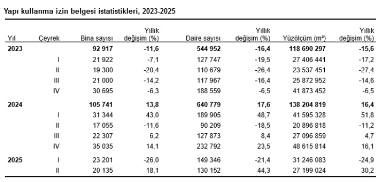 Yapı kullanma izin belgelerinde de artış gözlendi. 2025 II. çeyreğinde, bir önceki yıla göre bina sayısı yüzde 18,1, daire sayısı yüzde 44,3 ve yüzölçüm yüzde 30,2 arttı. Toplam yüzölçümün yüzde 85,5’i belediyeler, yüzde 14,5’i diğer idareler tarafından verildi. İki ve daha fazla daireli ikamet amaçlı binalar 18,4 milyon m² ile lider olurken, sanayi binaları ve depolar 3,5 milyon metrekare ile takip etti.