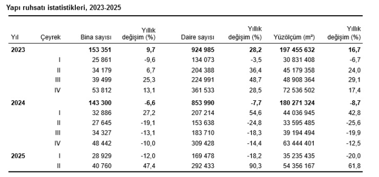 2025 yılı II. çeyreğinde, bir önceki yılın aynı dönemine göre yapı ruhsatı verilen bina sayısı yüzde 47,4, daire sayısı yüzde 90,3 ve yüzölçüm yüzde 61,8 arttı.