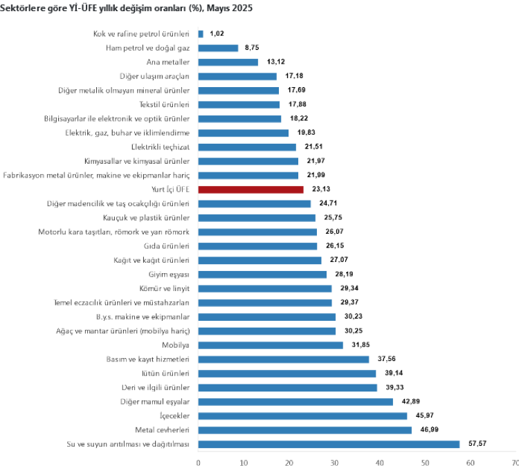 Yurt İçi Üretici Fiyat Endeksi (Yİ-ÜFE), Mayıs 2025’te sanayi sektörlerinde yükselişini sürdürdü, su temini ve enerji öne çıktı.